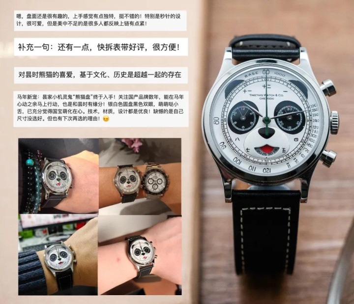 时辰到了25年,顿然刷到昙时的这枚“真熊猫盘”腕表,一眼心动的嗅觉。熊猫盘是计时腕表的经典盘面布局,亦然我的心头好(更复杂的功能不是不可爱,仅仅囊中憨涩哈哈)。此前我如故购买了不同品牌的多枚计时功能腕表,包括百年灵航空计时,欧米茄超霸,爱马仕,西铁城等,但传统品牌只会作念成凡俗的三眼或者双眼,靠不同的神采或者材质组成自家的设想说话。昙时就不相同了,径直把大熊猫搬上了盘面,原本国宝就东说念主义东说念主爱,怎么会不心动呢。