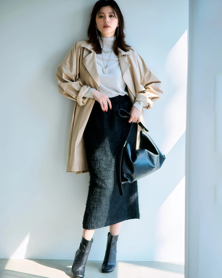 ✓ 淡色风衣配深色裙,下半身收窄显腿细 腿粗或者胯宽的姐妹刺眼了,下半身一定要选深色裙子,玄色、深灰、藏蓝都行,外面套一件淡色风衣,深色收窄下半身的抽象,下半身的线条看起来会纤细苗条许多,这招对梨形骸格太友好了。
