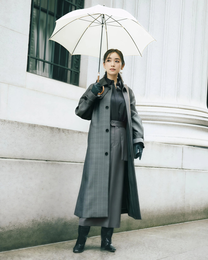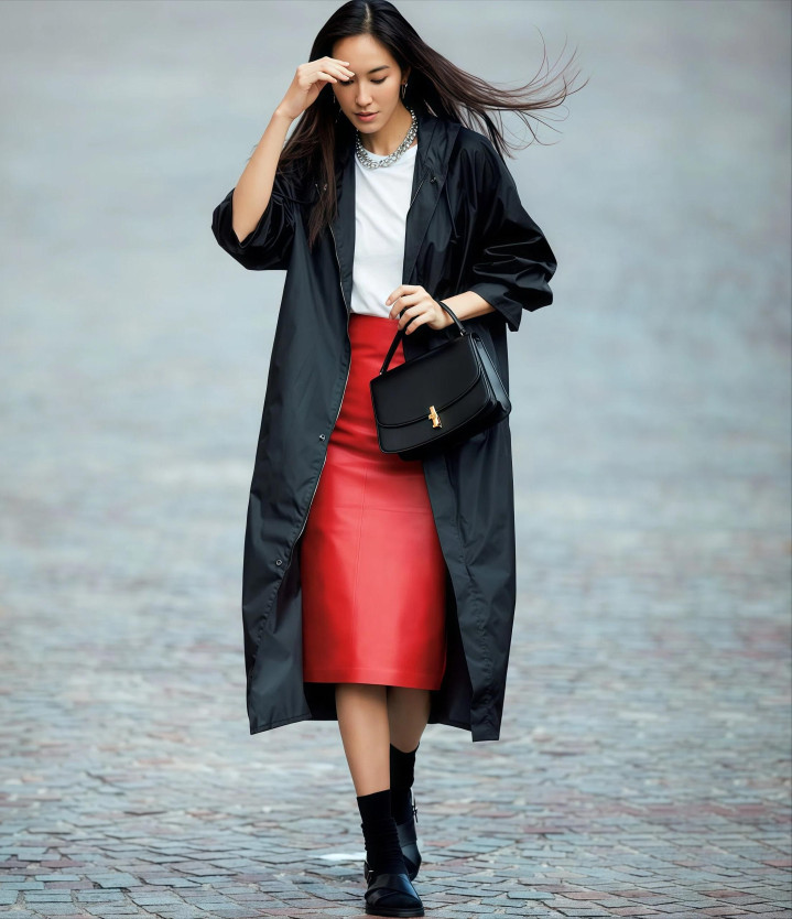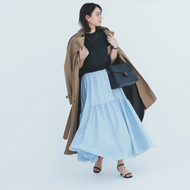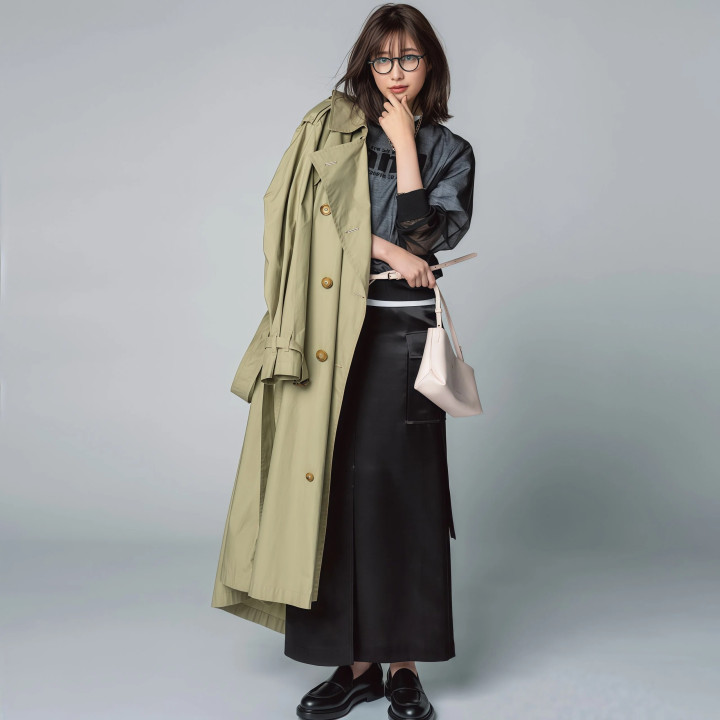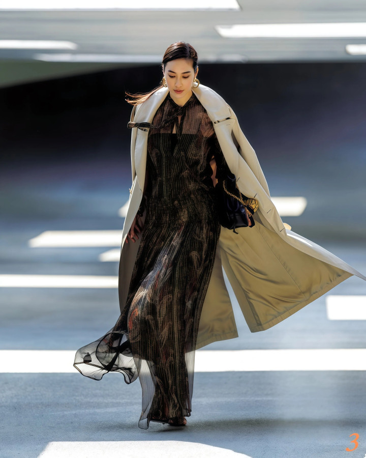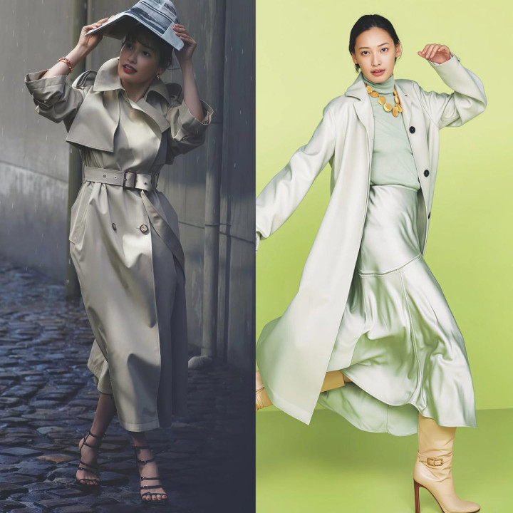 Tips2. 外层宽松+内层收紧,两者“松紧差”凸起体态弧线 ★ 短款收腰风衣配垂顺长裙,上收下放最显比例 风衣和裙子之间得有松紧差别,全身松垮穿上去毫无体态可言,很痴肥。短款收腰的风衣配一条垂感好的长裙,风衣在腰部收住,裙子当然往下垂落,体格弧线明晰分明,这才是风衣配长裙该有的穿法。
