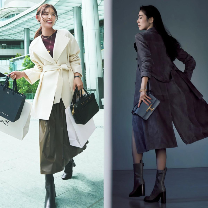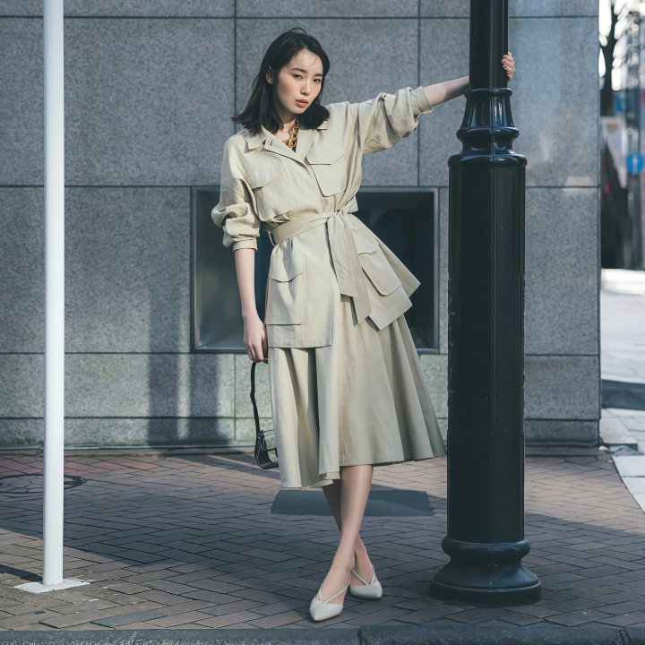 <二> 管好这几组“比例相关”,穿风衣+裙子就不显矮不显胖 Tips1. 用腰带或塞衣角锁定腰线,分割体格比例 ★ 系优势衣自带的腰带,一秒划出高腰线 风衣+长裙最容易踩的雷就是显矮,潦倒都是长款单品,腰线澈底盖住了,体格比例全靠猜,把风衣自带的腰带系上去,高腰线标出来之后,上短下长的分割独特彰着,腿的比例拉长许多。