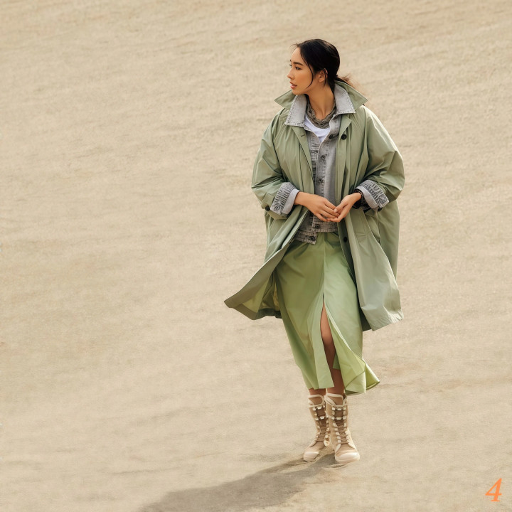 ✓ 绿色风衣配同色长裙,春天氛围感拉满 绿色系在春天穿太应景了,风衣和长裙都选同色系的绿,深绿浅绿橄榄绿都行,潦倒一体的色调干净清亮,鞋子用白色或者米色来过渡,整套搭配看着独特酣畅养眼,很有春天该有的那种簇新嗅觉。