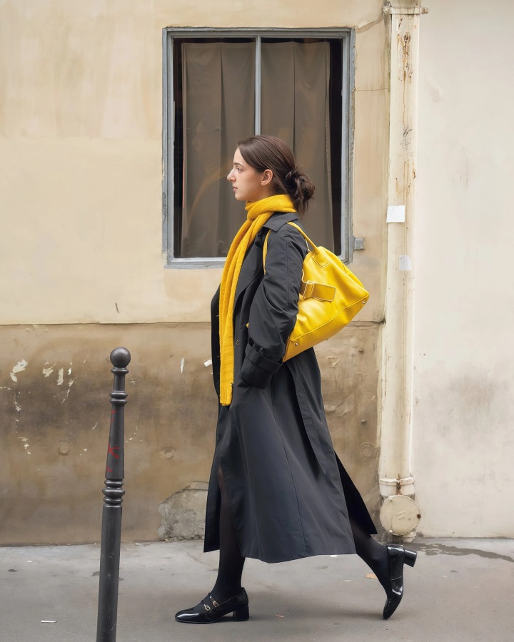 NO.3 全身都暗千里?去加一件亮色单品 ★点缀亮色领巾或彩包,提亮最省力 全身深色风衣搭深色长裙,不作念点缀穿出来灰蒙蒙的,没精神还独特压气色,这是风衣配长裙最常见的翻车。 最简便的救场目标,就是加一条亮色领巾,或者换一只彩色的包,黄色橘色亮蓝色都行,一小块亮色就能突破全身的千里闷。