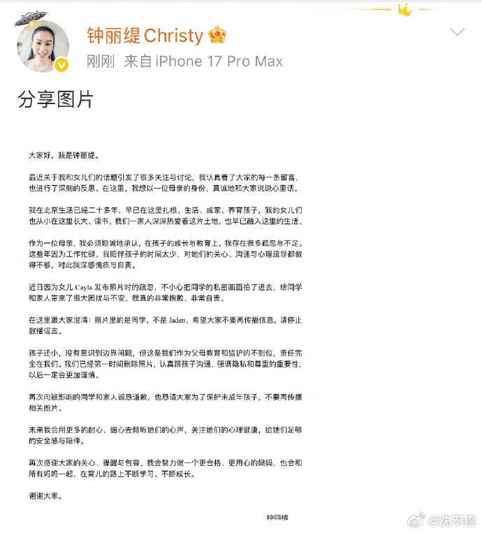 在这篇备受争议的说念歉长文中,钟丽缇率先廓清了一个首要信息——马桶上的女孩不是我方的二男儿Jaden,而是考拉的同学。关连词,这个廓清非但莫得起到正面遵守,反而让网友愈加大怒。各人觉得,既然是同学,考拉的行径就愈加过分,这如故组成了对素东说念主的霸凌。钟丽缇持重廓清的举动,在网友看来更像是为了保护Jaden的仙女形象,惦记影响其日后出说念,而非信得过为被侵权同学着思。