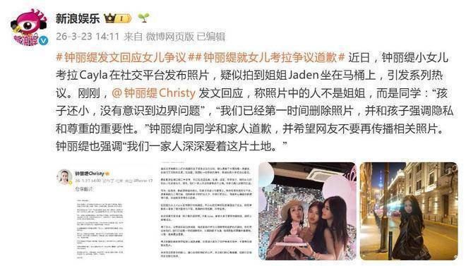 近日,钟丽缇的小男儿考拉(Cayla)因一张自拍照堕入公论旋涡。像片中,考拉不仅给我方胸部打码保护秘籍,却将正在上茅厕的同学径直闪现在镜头前,这种双重设施的行径激发网友厉害不悦。跟着争议握续发酵,钟丽缇终于在3月23日中午坐不住了,发布长文替男儿说念歉,关连词这篇说念歉信非但没能平息风云,反而让事态进一步升级。