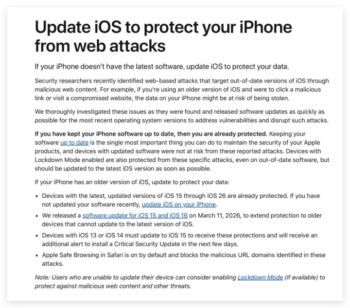 安全流弊让骇客会透过网页袭击iPhone 苹果之是以会严厉发出申饬,是因为此次的安全风险一种常见但难以严防的袭击形势「透过网页流弊袭击iPhone」。 安全商讨东谈主员发现,骇客正在行使一些特地针对iOS 的袭击用具(举例Coruna、DarkSword),搭配坏心网站或垂钓都集进行袭击;这类袭击不需要下载App,也不需要相称操作,唯有点到都集或开启网页,就有可能在不知情的情况下遭到袭击,以致导致贵府外泄。 现时在中国、乌克兰、沙乌地阿拉伯、土耳其、马来西亚等地都有出现袭击案例,天然现时尚未出现大限制袭击的左证,但这些用具本色上对iOS 13、iOS 14 或更旧版块的iOS 都有用,是以苹果才会条款用户尽快更新,以确保安设安全。