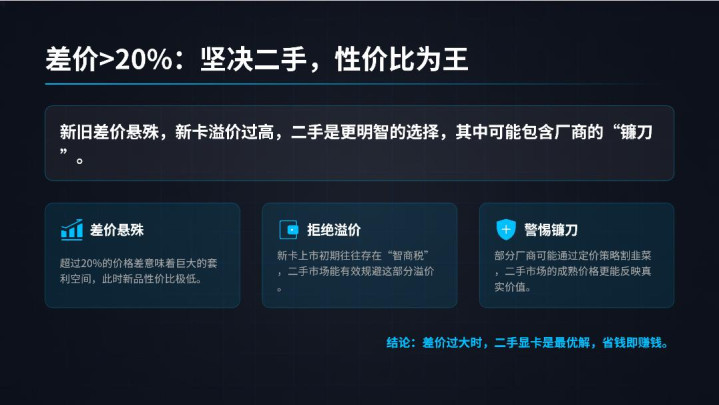 然后呢便是新卡和老卡差价大于20%的卡。这种情况就顽强不要买新卡,优先洽商二手,新旧差价如斯悬殊的显卡,其中必定包含着厂商最为利害的镰刀。