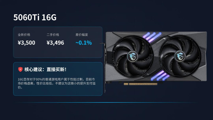 第三款是5060TI 16G,全新价钱3500,二手价钱3496,无谓念念径直买全新。这个级别的大显存关于90%的游戏用户齐没用,能用上16G显存的也不会洽商这个级别的显卡,竟然和8G版块的差价1000元,涨价幅度堪比苹果。我给出的提倡是看齐不要看这个16g