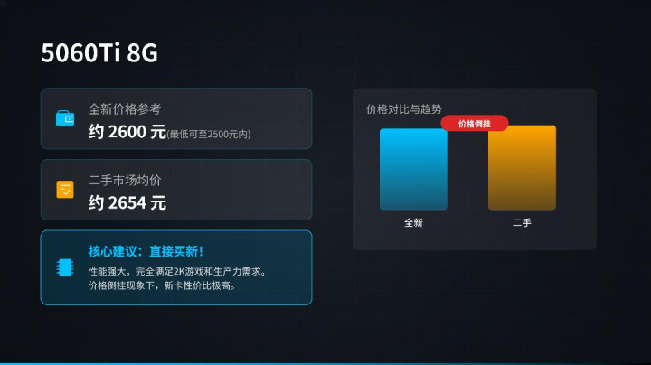 第一款便是5060Ti8g,这几天的猖獗全国也齐看见了,最低的价钱是在2500以内,但大无数东谈主能买到的价钱应该在2600,联系词4月黄鱼的行情价钱价钱是2654,竟然比新卡还贵,价钱出现倒挂情况。关于等闲家庭用户来说,5060TI齐备是高端显卡了,岂论是2K游戏,照旧处分坐褥力这张卡完万好像胜任。