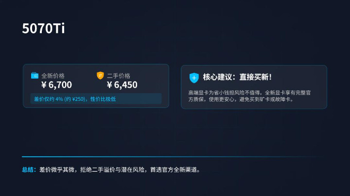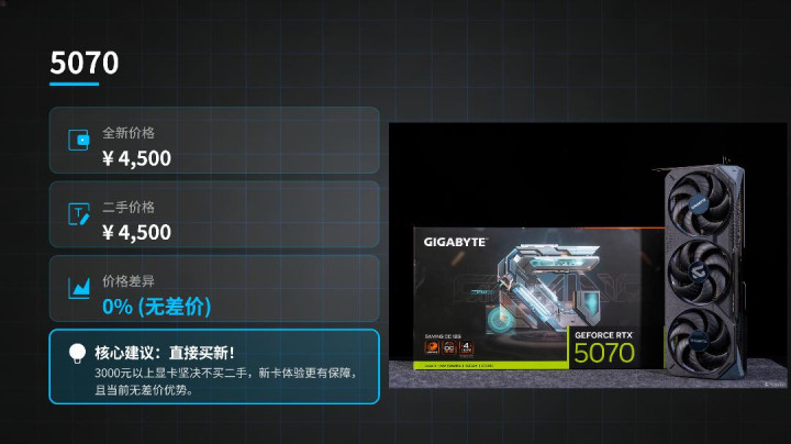 第二款显卡是5070,全新的价钱是4500,二手行情价钱竟然亦然4500,3000元以上显卡顽强不要买二手,径直全新的走起,玩游戏用到5070就还是到头了,再贵的显卡得优先洽商拿来收货。