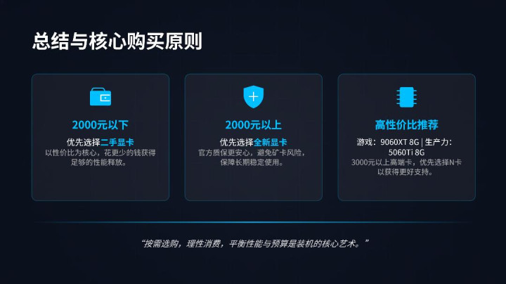 全国买显卡有个原则,2000以下的显卡优先买二手,保证性能。2000以上的卡优先买新卡保险售后,平等闲东谈主来说2000多买张显卡还是相当贵了,加上本年岂论是A卡照旧N卡齐不会再推出新品,是以不错省心购买了无谓惦记被新品背刺。而在2000以上的全新显卡中,值得推选的便是9060XT8G,5060TI8G,纯游戏选A卡,干活就老真挚实选N卡。3000以上的显卡,关于等闲 用户来说老真挚实买N卡,“3000 元以上买 A 卡,你不仅是在挑战初始的剖判性,你还在挑战二手市集的流动性。高端 A 卡的相当不是性能,是‘难以起先’的孤苦。 这期视频就到这里,数据每周齐会更新,显卡行情每周变环球体育,但卖家的野心不变,善良我让黄鱼传家宝始终传不到你手里。你会选拔高端A卡来玩游戏吗,齐留言联系下。 B体育官方网站首页入口