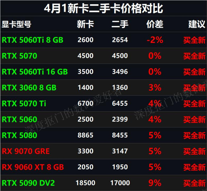 70GRE,新卡3300左右,二手3147差价5%,关于3000以上买A卡,况兼是用来玩游戏的玩家我是极其不提倡,环球体育登录入口3000以上的高端显卡我只提倡买N卡,岂论是软件生态照旧后期的起先空间。除非你的钱是大风刮来的。 然后是9060XT8G,新卡价钱在2050,二手卡的价钱在1950,差价也只消5%。这个A卡我口舌常推选的,他然则和5060Ti坐一桌的,但当今比5060齐低廉,齐全的讲授了A卡购买定律,那便是同档要比N卡低廉20%,同期性能要比N卡高20%才值得购买。 然后是5090DV2,买这张V2显卡的细目不是用来作念科学诡计的因为齐先的是32g的,要是是游戏那细目是富哥在买,齐买如斯贵的卡了赤忱不提倡再买二手了,新旧差价仅9%。