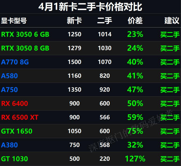 接下来是新老差价在10%-20%的显卡,一共就这样几个,记着一个原则,这个价钱段,2000以下买二手,2000以上买全新。这内部除了A310打死齐不值得买,其他的茹毛饮血即可。