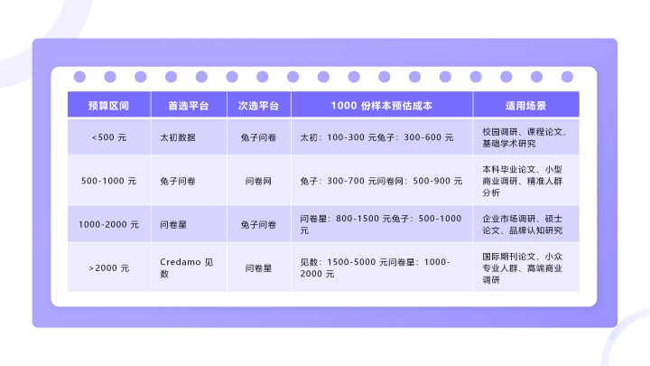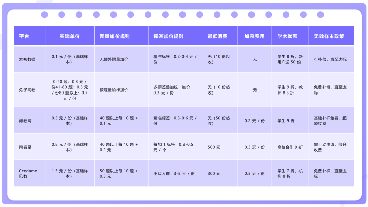 速览中枢论断: 极致廉价(0.1 元 / 份起):元始数据(大学生样本为主,适合大批量基础调研) 高性价比(0.3 元 / 份起):兔子问卷(学术级质控 + 透明订价,适合学术 / 精确调研) 中端价位(0.5 元 / 份起):问卷网(基础功能完善,适合中小微 / 个东谈主) 中高端(0.8 元 / 份起):问卷星(生态闭环,适合企业一体化调研) 高端学术(1.5 元 / 份起):Credamo 见数(海外期刊认证,适合高门槛学术 / 小世东谈主群) 一、价钱版单总表(中枢数据对比)